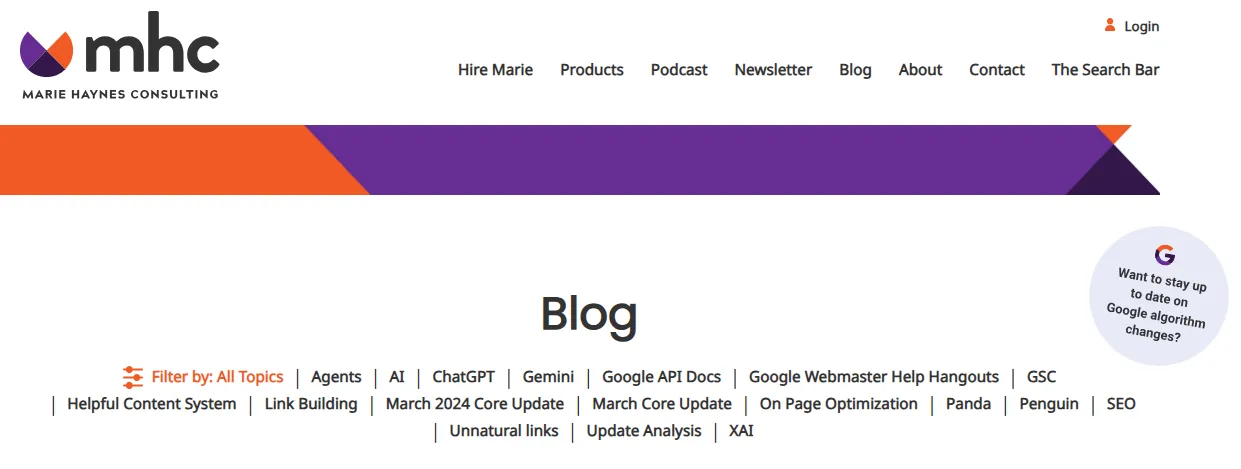 If you’ve ever dealt with a sudden ranking drop or a confusing Google update, Marie Haynes is the person you want to learn from. Her blog focuses on Google penalties, quality updates, E-E-A-T, and the signals that influence how Google decides which pages deserve to rank.