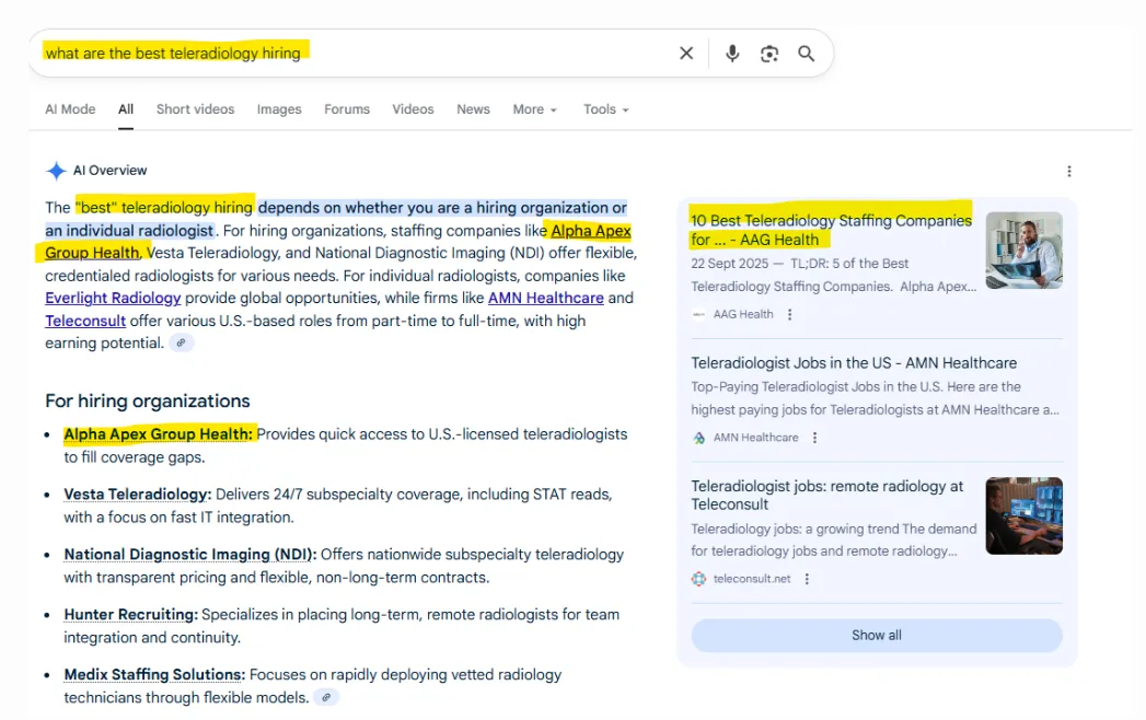 For example, we helped our client Alpha Apex Group Health rank first in AI overviews for a slew of key terms for them, like teleradiology hiring companies: