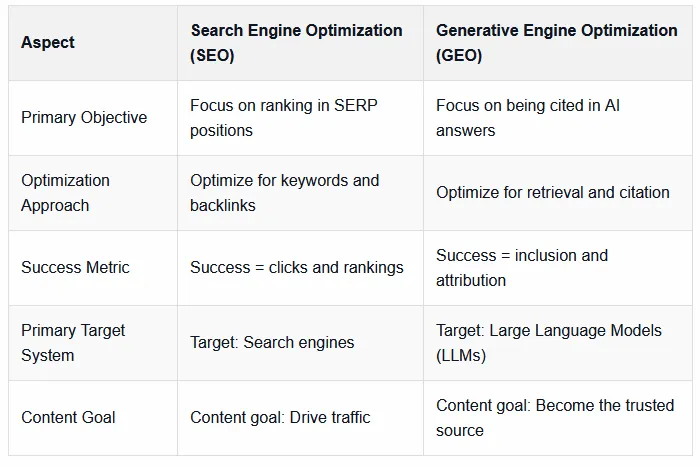 Understanding the differences is critical. This graphic shows what sets SEO and GEO apart: