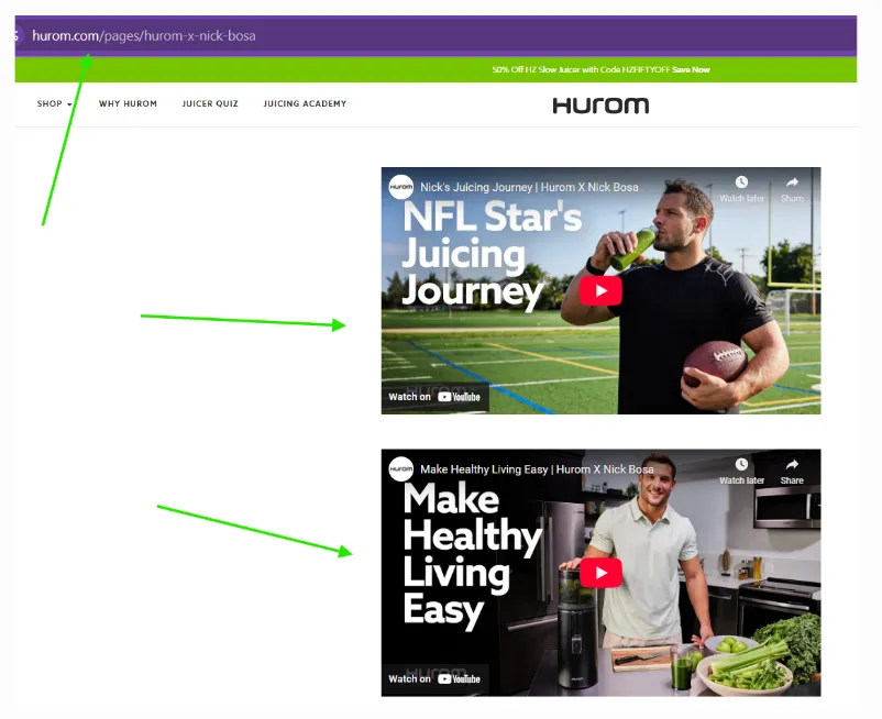 Nick Bosa himself also features in Hurom’s content, giving the brand crossover appeal and social media strategy momentum. And Hurom embeds these videos on their website:
