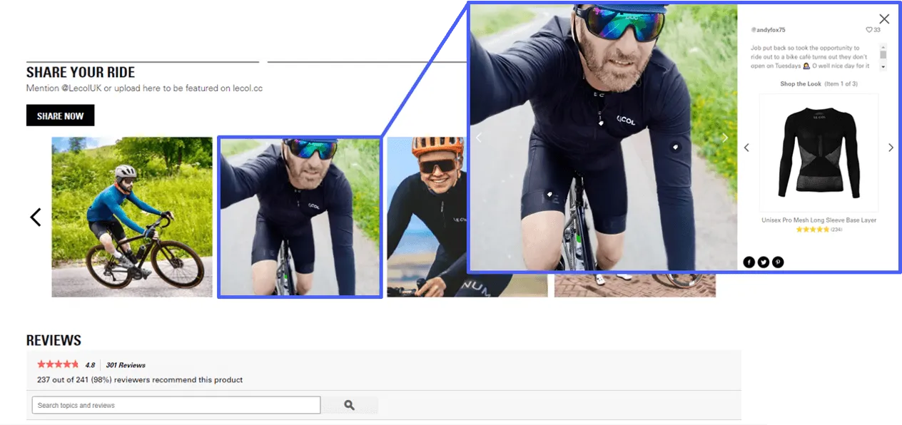 The premium cycling gear brand repurposes customer reviews and authentic lifestyle images across its website, product galleries, and retail partner sites.