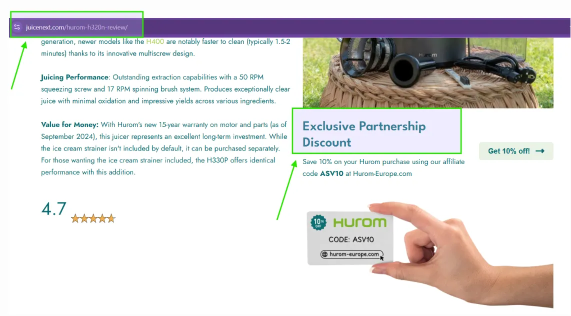 The main keyword here is something really aligned to people’s buying intent: “Hurom H320 review.”